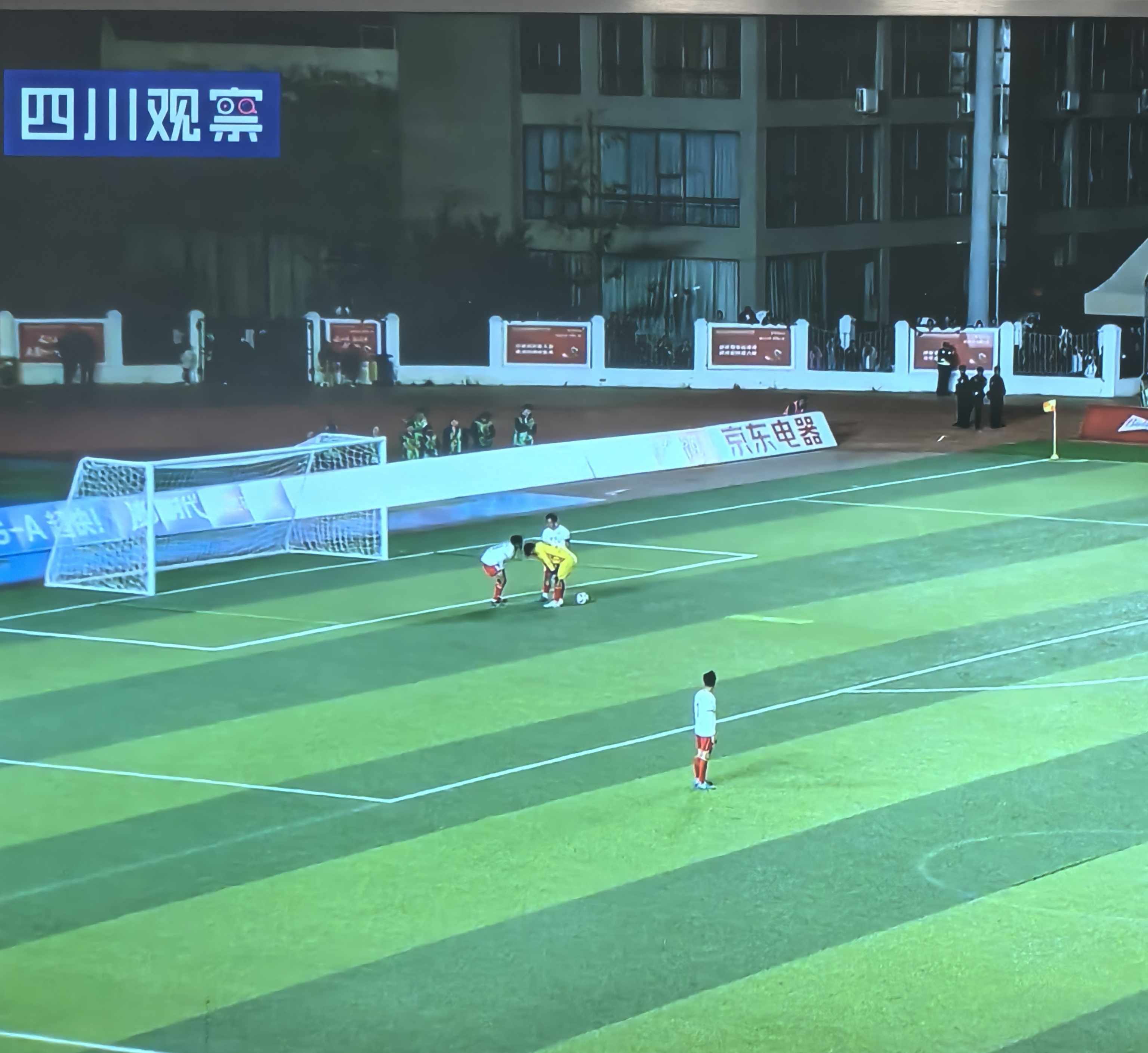 比赛来到第76分钟,阿坝州雪山雄鹰队获得弧顶定位球机会。一分钟后,阿坝州队11号球员泽瓦里罗主罚,足球划出一道完美弧线,应声入网,将比分改写为1:0。
