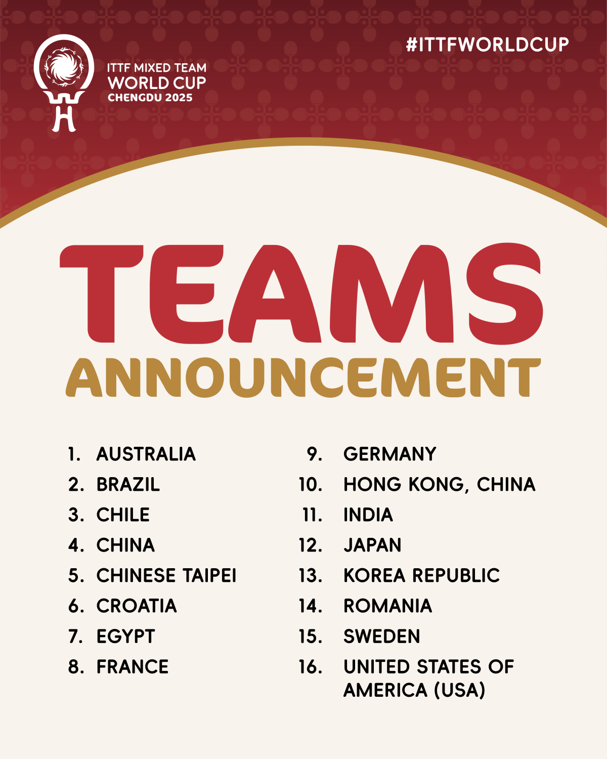 配资股票最新行情 国际乒联确认混合团体世界杯16支参赛队