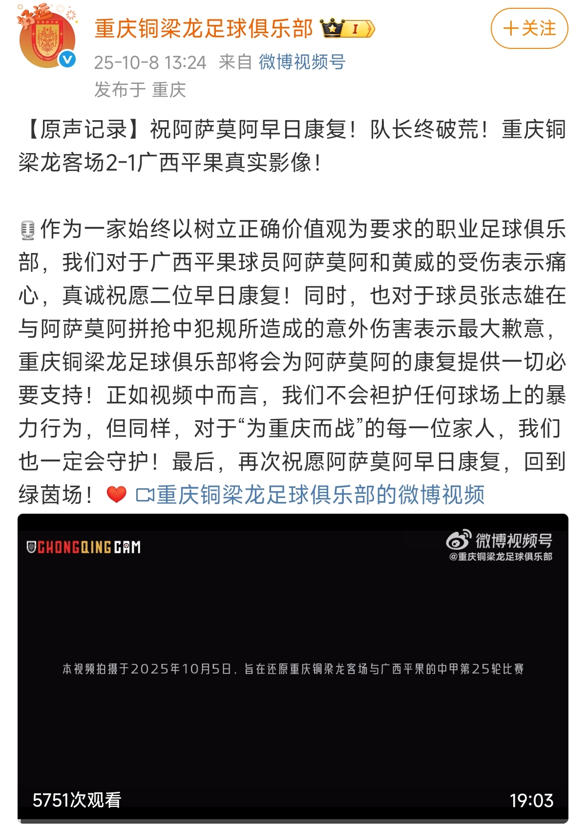 同时,铜梁龙俱乐部表示,对阿萨莫阿的意外伤害“表示最大歉意”,承诺为阿萨莫阿的康复提供一切必要支持。